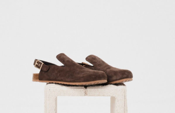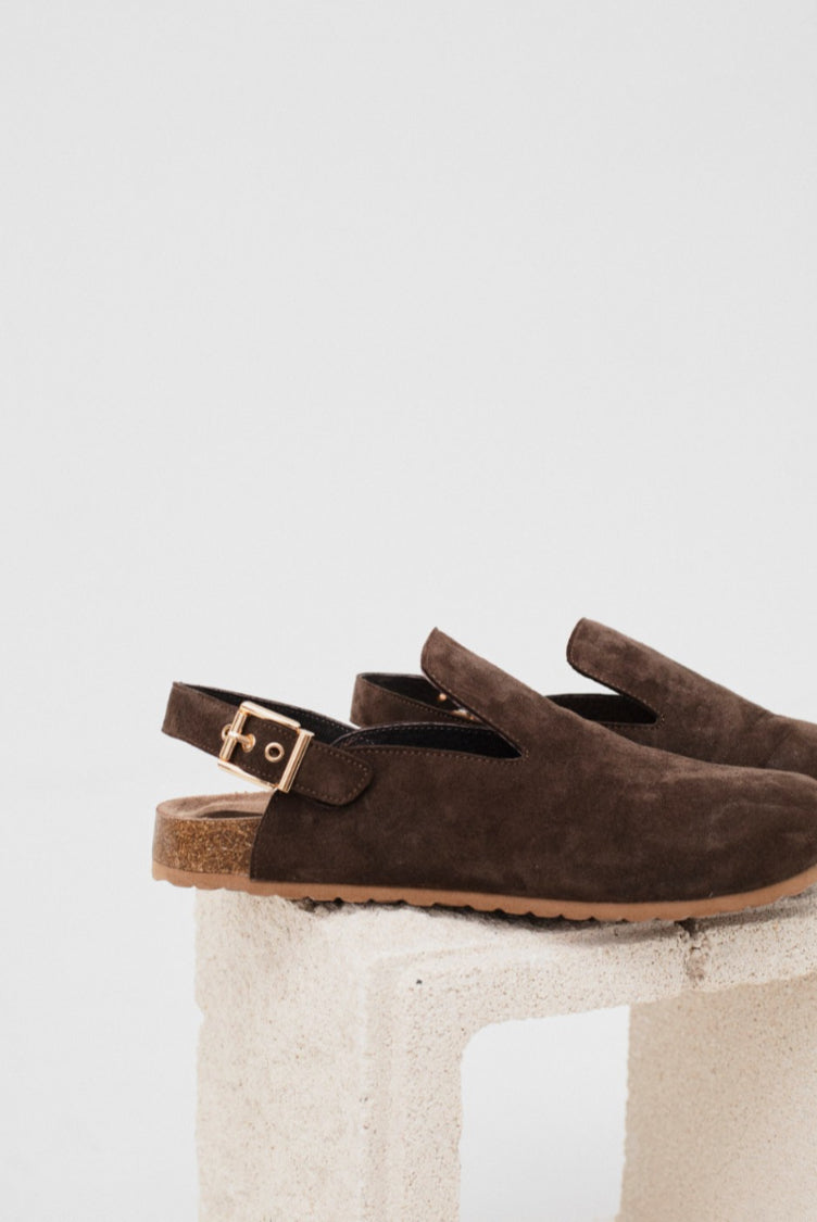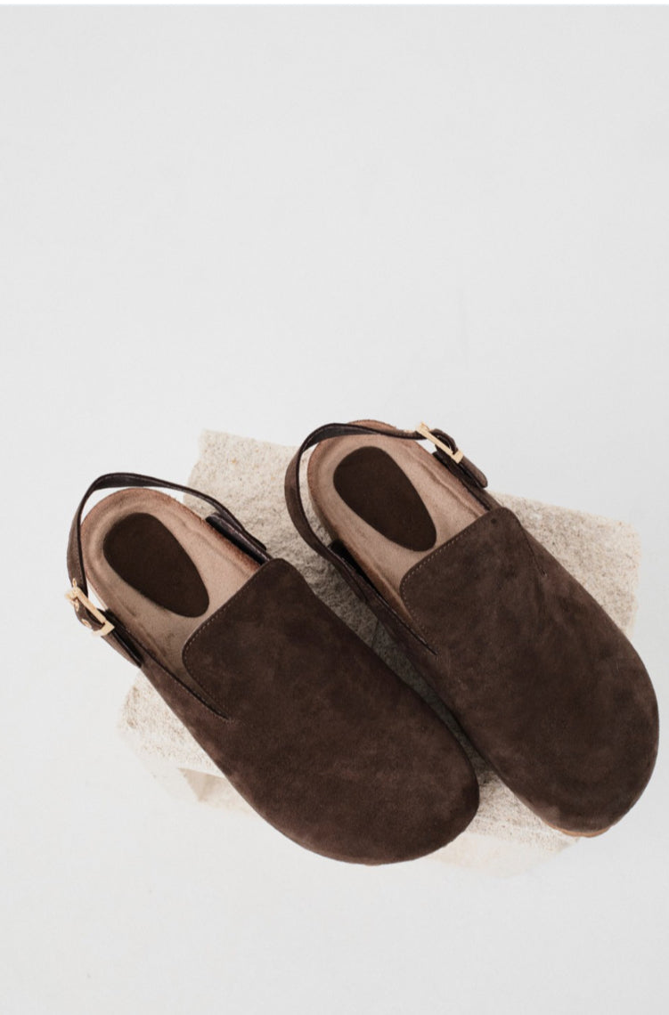 Split leather clogs, open at the back where they close with an adjustable strap and golden buckle. They have a rubber sole and the logo engraved on the heel insole.