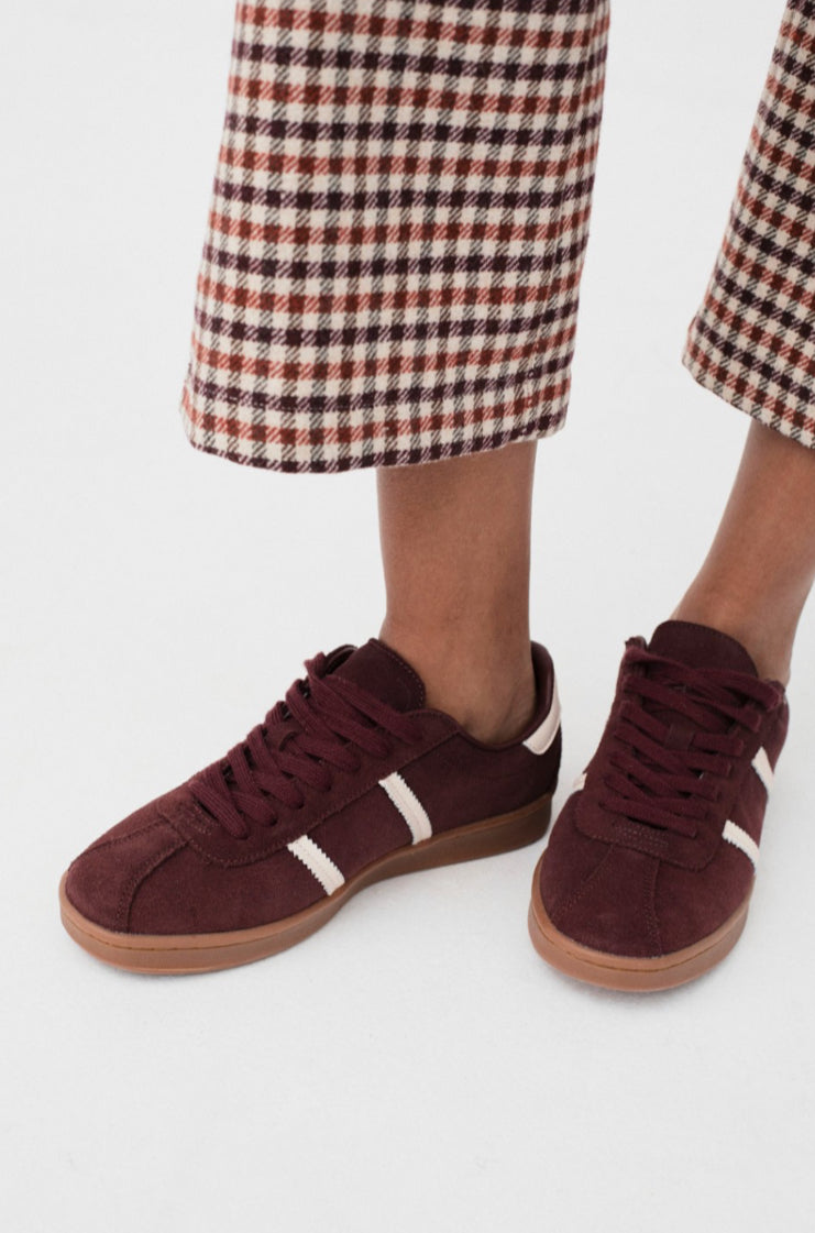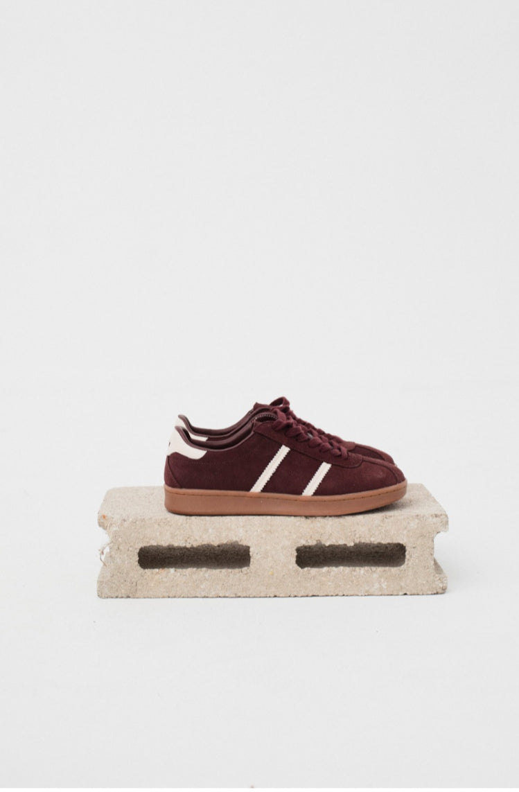 Split leather sneakers in burgundy with two side stripes in contrasting colour. Rubber sole and tone-on-tone flat laces. It also features the Mus&Bombon logo on the heel and insole.