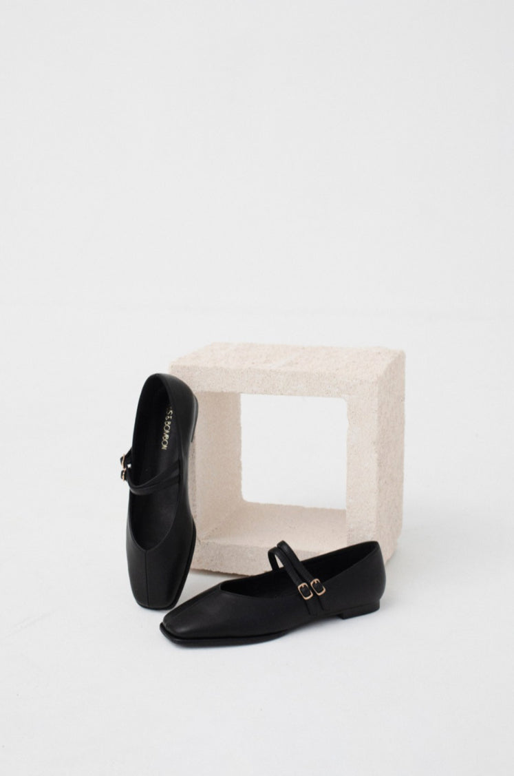 Ballerinas with two straps and golden buckles, square toe and simple stitching details. Rubber sole and low heel. Ideal for all occasions.