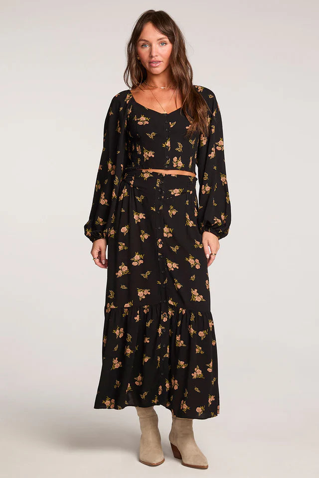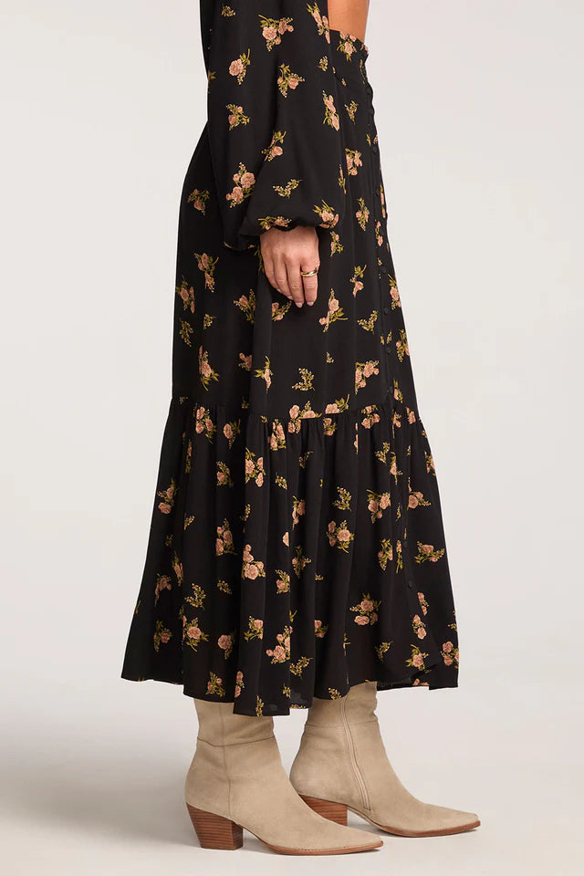 The Dagny Midi Skirt showcases a classic high-waisted silhouette with a roomy tiered skirt in a dark botanical print.