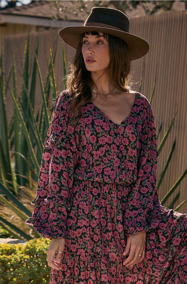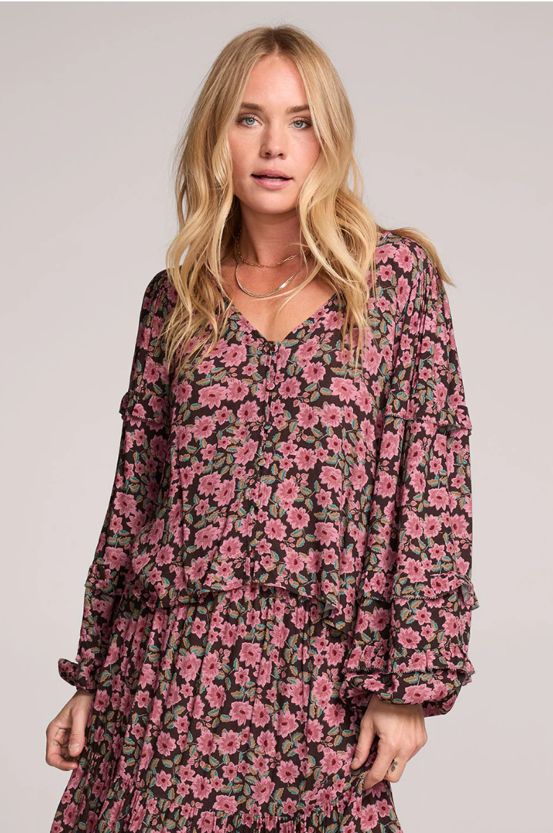 The Zaylor Top features flowy bell sleeves gathered at the wrists and a graceful V neckline, adorned with a sweet floral pattern that exudes dreamy romance.