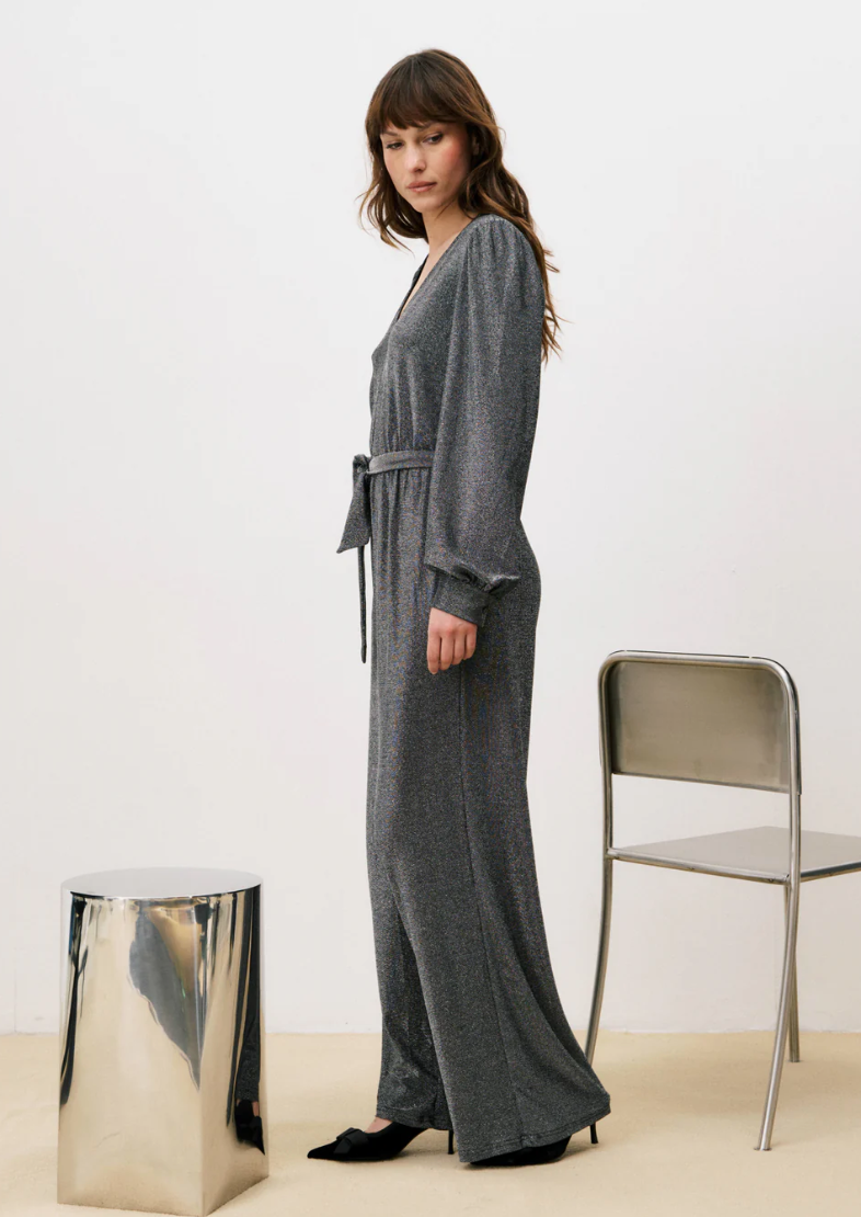 Embrace effortless elegance with the FRNCH Barry Playsuit, a daring statement piece that commands attention. This fluid creation features a flattering V-neck and loose, flowing silhouette that moves with you. Dramatic puffed sleeves with gathered cuffs add theatrical flair, while the elasticated waist defines your shape without restriction. The removable tie belt in matching silver lets you customize your look—cinch it for definition or leave it loose for pure freedom. Crafted from a luxurious blend of polyamide, modal, and elastane, the shimmering metallic fabric drapes beautifully and feels supple against your skin. Perfect for those ready to take fashion risks and stand out.