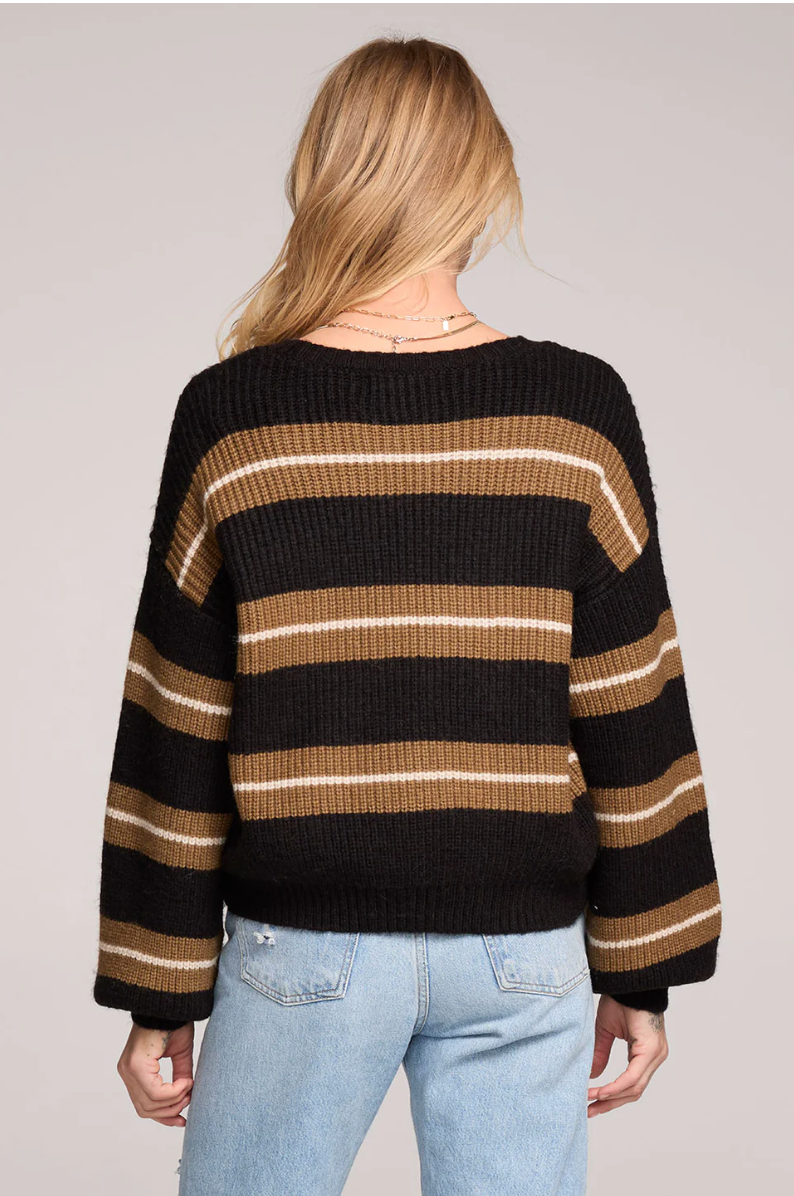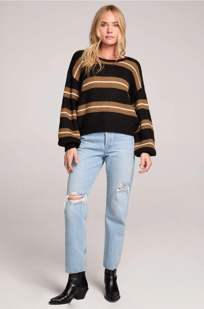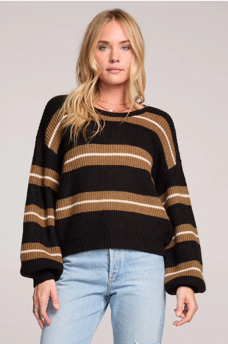 The Mimi Black Sweater features a wide stripe motif and oversized sleeves gathered at the wrist, creating a relaxed yet refined silhouette.