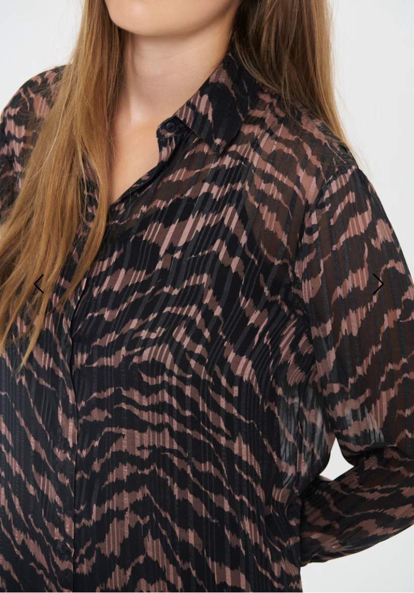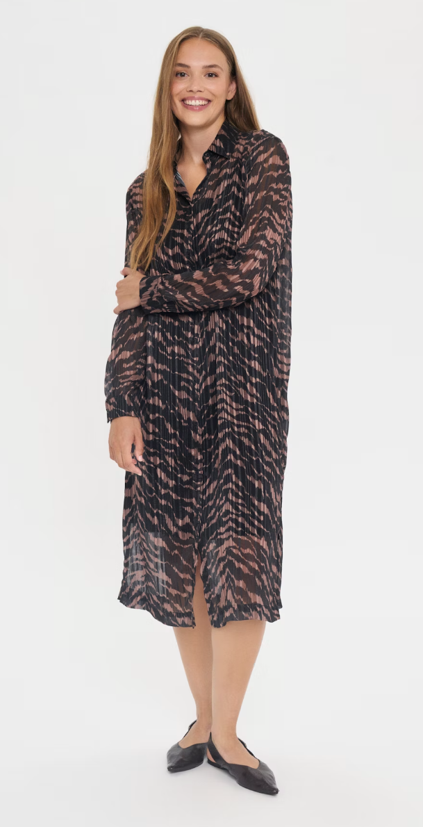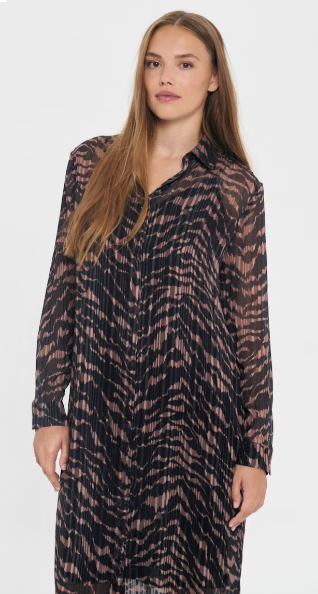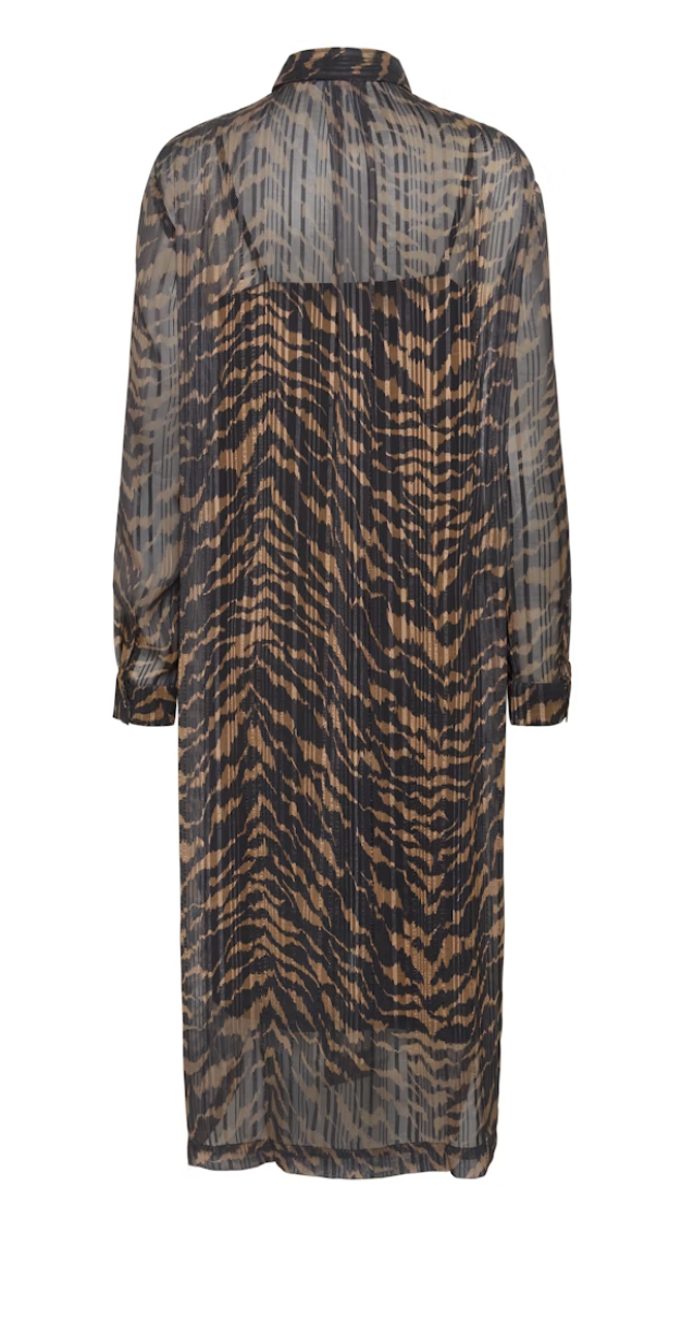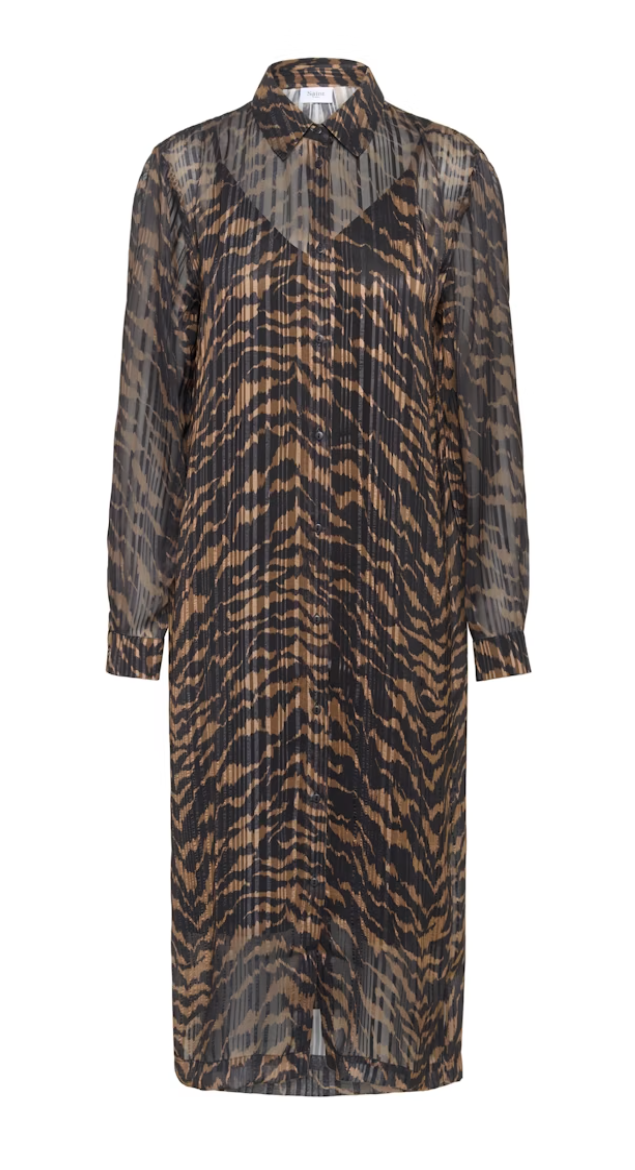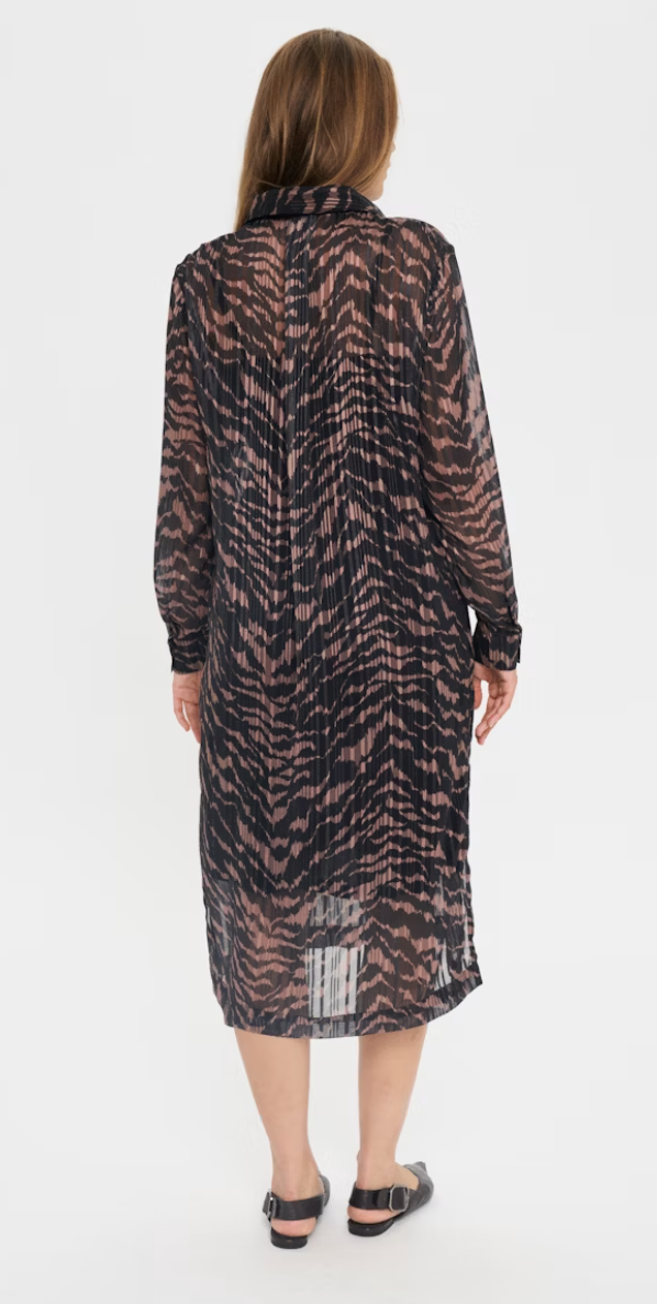 Midi shirt dress with an all-over semi-sheer, softly pleated texture. Features a pointed collar, button front closure, and long sleeves. Relaxed, straight silhouette and side slit at the hem are clearly visible.