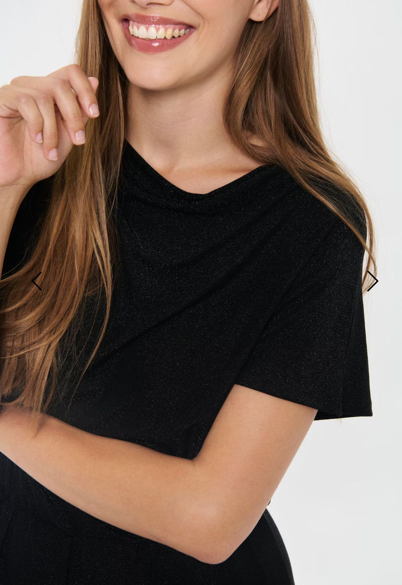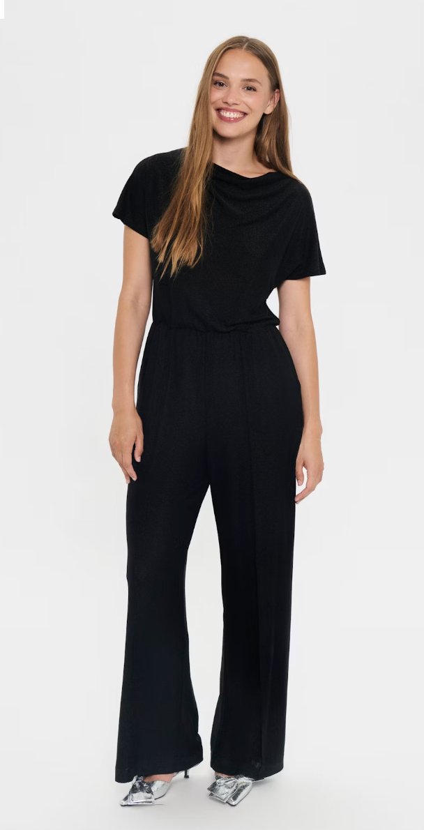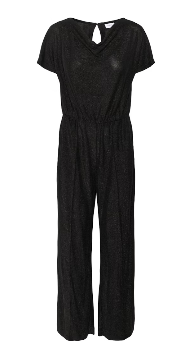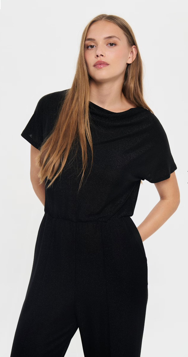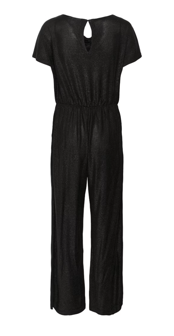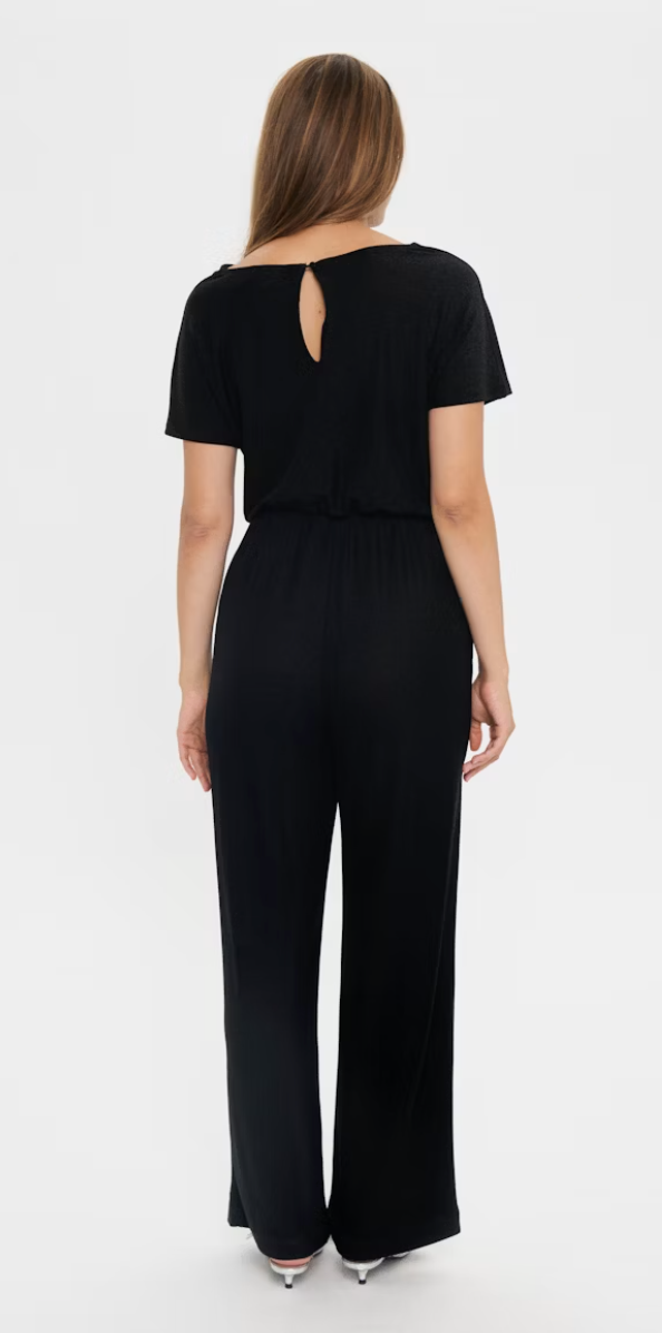 This jumpsuit features a wide-leg fit with short sleeves, a draped neckline, and a keyhole back detail. The elastic waistband creates gentle shape while the soft, subtly shimmery surface adds texture.