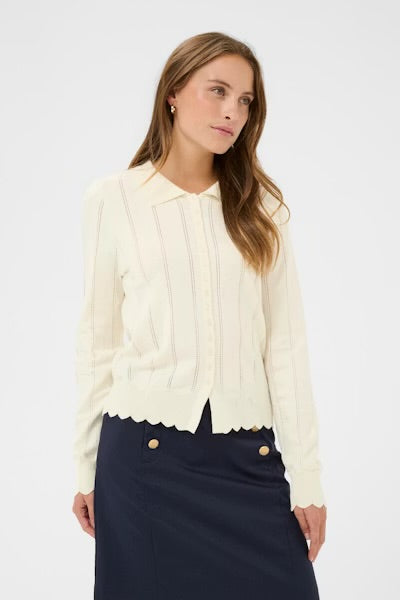 Cardigan sweater for women with a regular fit, button-down front, and collared neckline. Scalloped edges and ribbed detailing add subtle design interest, while long sleeves enhance comfort and versatility for various occasions.