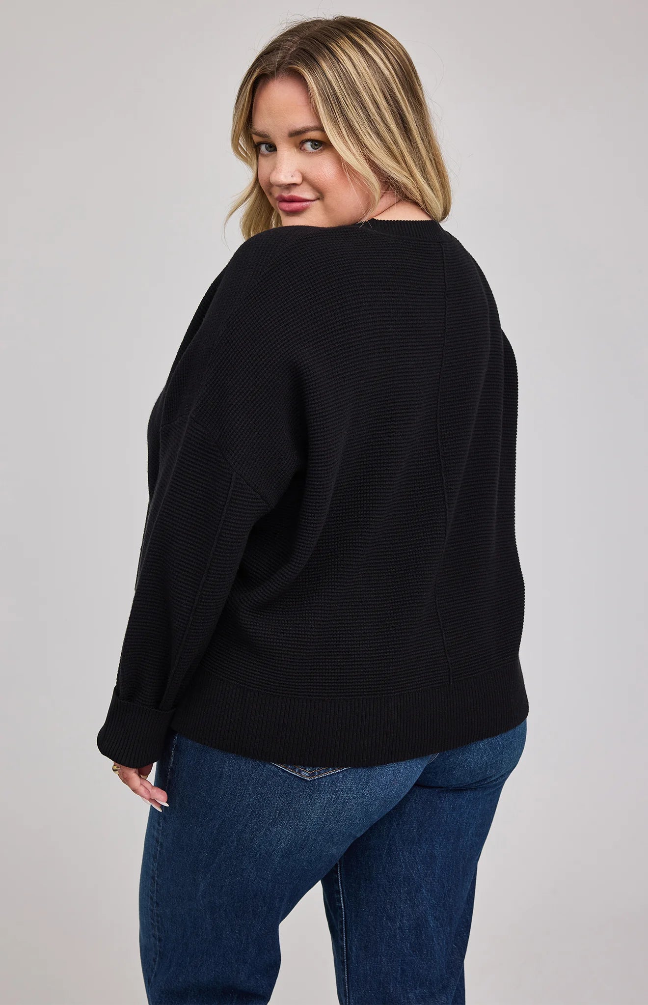 The Axel sweater is made of a soft yarn in a waffle knit pattern. Features include a crew neckline, seam details, and side slits.