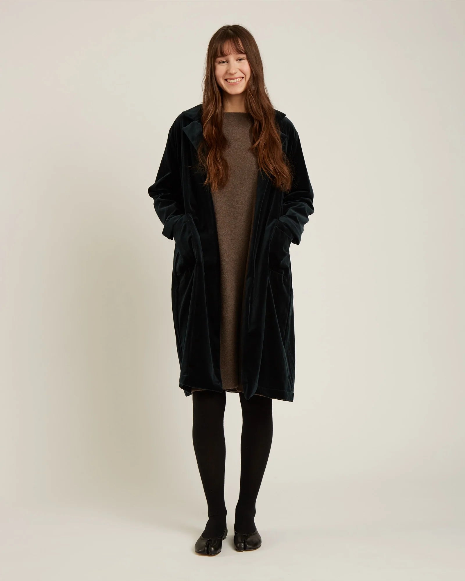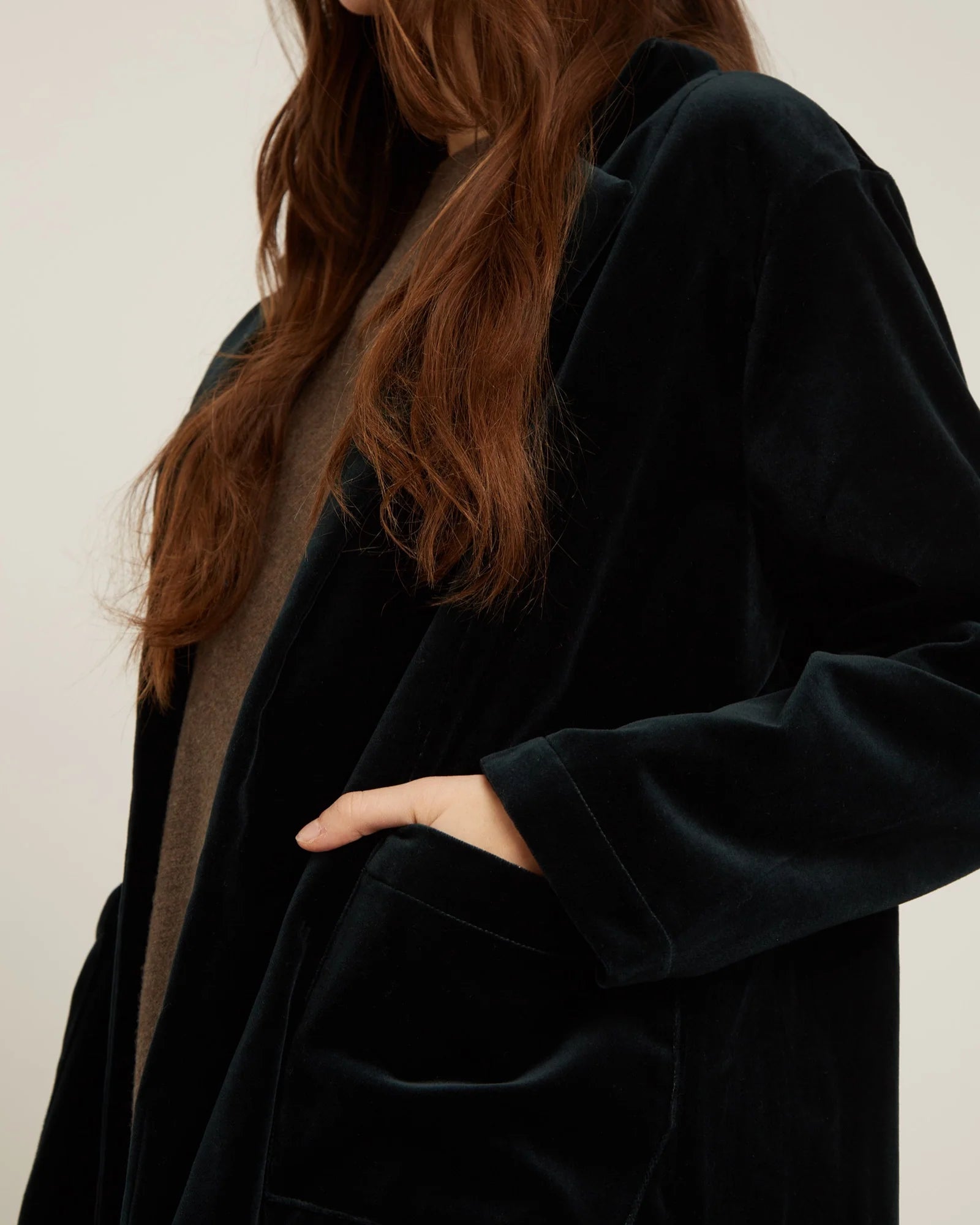 The Barton Coat is a luxurious velour overcoat in a deep emerald green, made from 100% cotton for exceptional comfort and breathability. To maintain its rich texture, hand wash gently in lukewarm soapy water for 15 minutes without rubbing. Avoid wringing and dry flat to preserve the coat's shape and fabric integrity. This expert care ensures your coat stays vibrant and soft season after season.