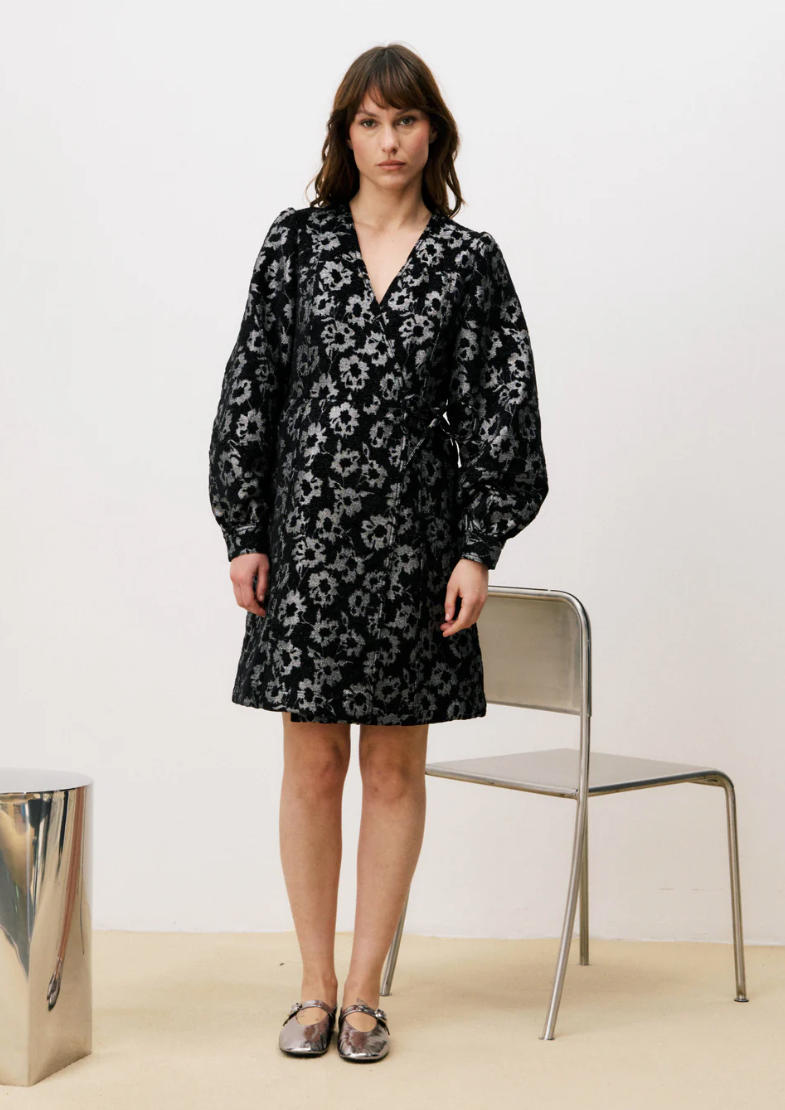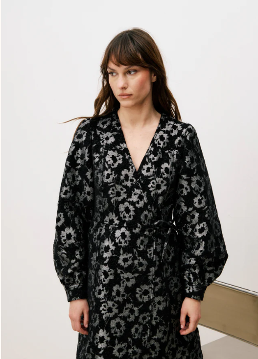 Embrace effortless elegance with this striking wrap dress that commands attention. Featuring an all-over black and silver lurex floral pattern, it combines sophistication with bold flair. The flattering V-neckline and voluminous long sleeves create a dramatic silhouette, while adjustable side ties cinch your waist for a personalized fit. The gently flared cut moves beautifully with every step. Crafted from a luxurious blend of polyester, cotton, and modal, this piece transitions seamlessly from day to night, proving that daring style never goes out of fashion.