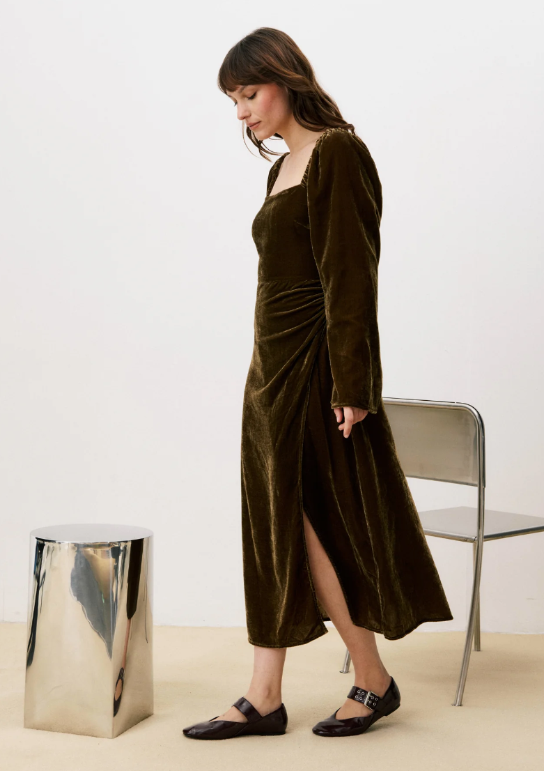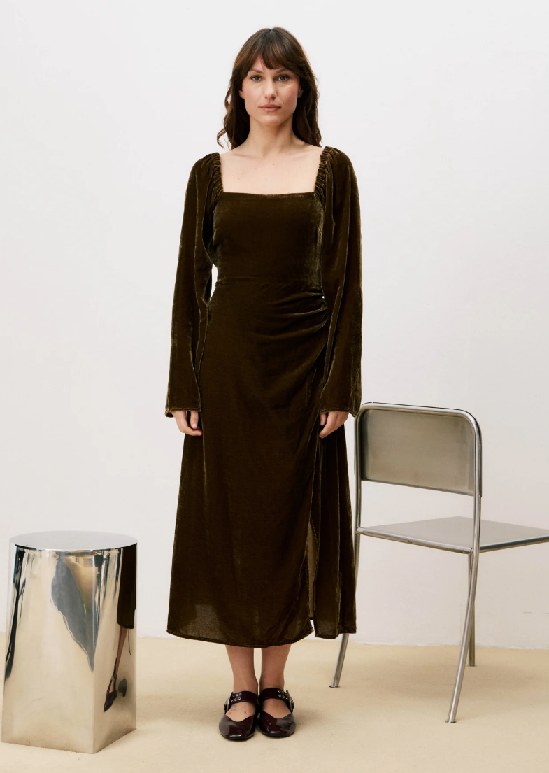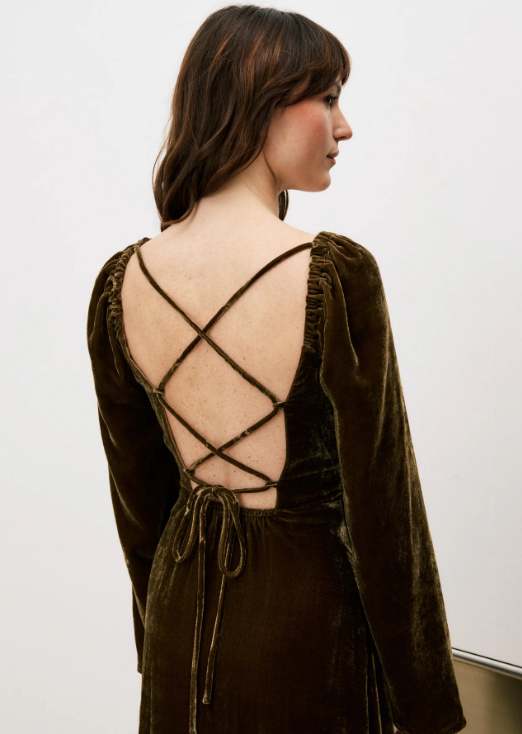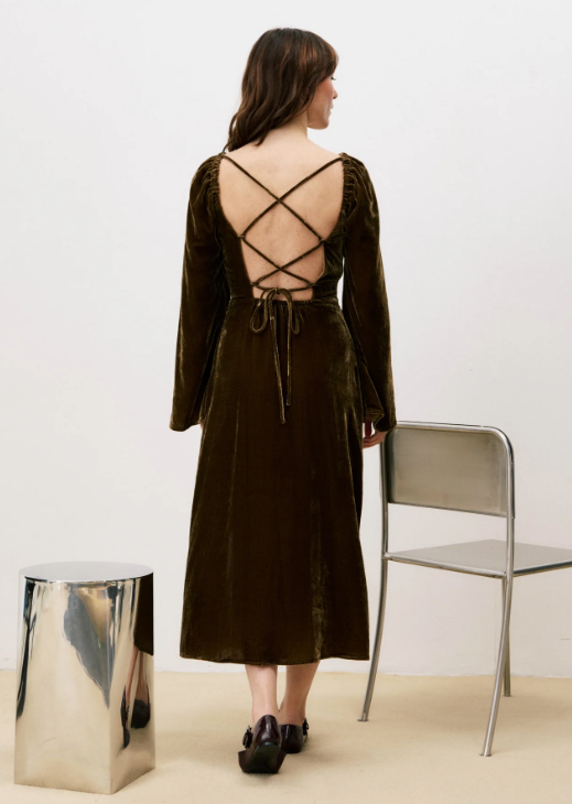 Embrace effortless elegance with the FRNCH Thelma Dress, a flowing maxi that commands attention. The square neckline frames your silhouette while delicate shoulder gathers add dimension, and slightly flared sleeves create graceful movement. A draped hip detail flatters your curves, while the daring crisscross lace-up open back with adjustable ties reveals just enough to turn heads. Crafted in sumptuous iced brown velvet, this statement piece transitions seamlessly from evening events to bold daytime styling. Pure polyester for easy care and all-day comfort.