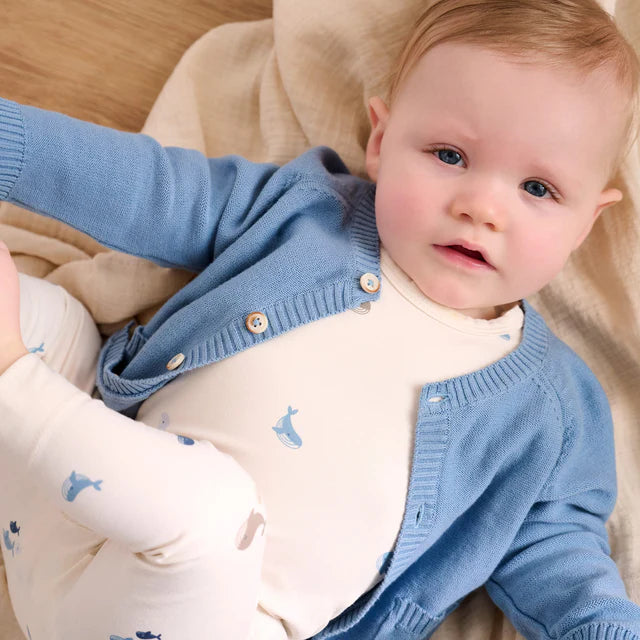 The sweetest Knit Blue Cardigan by Fixoni will have your baby stylish and cozy this spring. Made from 100% organic cotton. Pairs perfectly with the Knit Blue Pants.