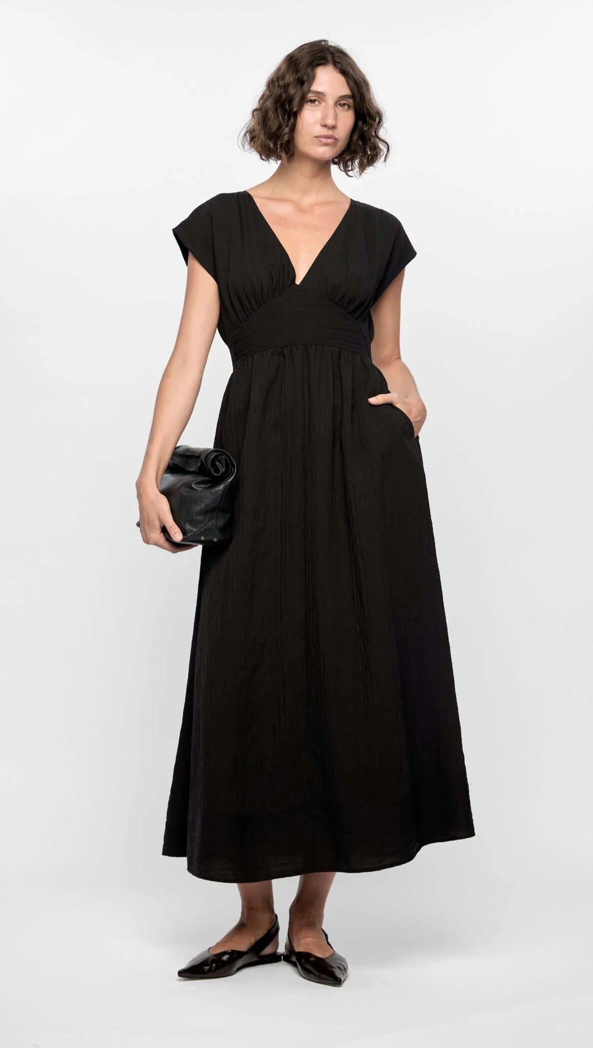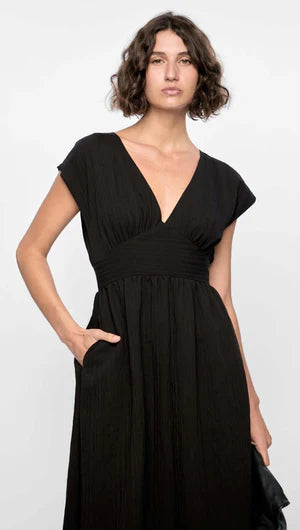 The Marlow Midi Dress is the definition of effortless elegance. Made from a soft, crinkled fabric, it features a flattering V-neckline, wide waistband and a floaty A-line skirt that moves beautifully. Whether you are heading to a long lunch or dressing it up for an event, this black midi is your versatile go-to.