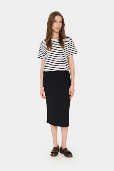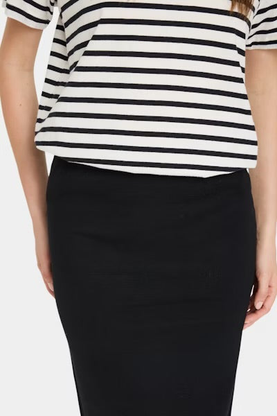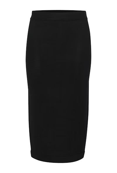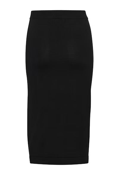 Black form-fitting skirt with an elastic waistband. Your go-to fall piece will pair effortlessly with boots for the cozy fall look.