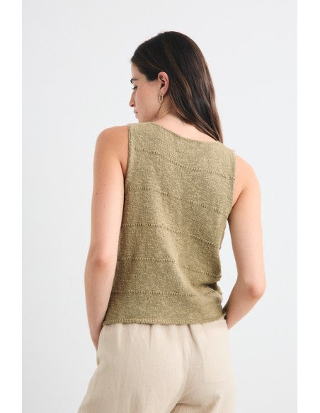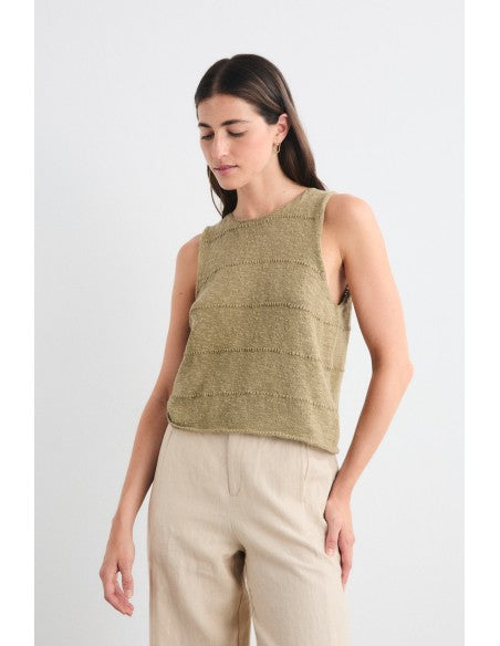Fancy knitted sleeveless top with round neckline by Mus & Bombon. A light and delicate garment that pairs well with a variety of bottoms. With a fabric composition of 74% cotton, 18% Viscose and 8% Linen, your body will thank you. Comfort, quality and style, all in one top.