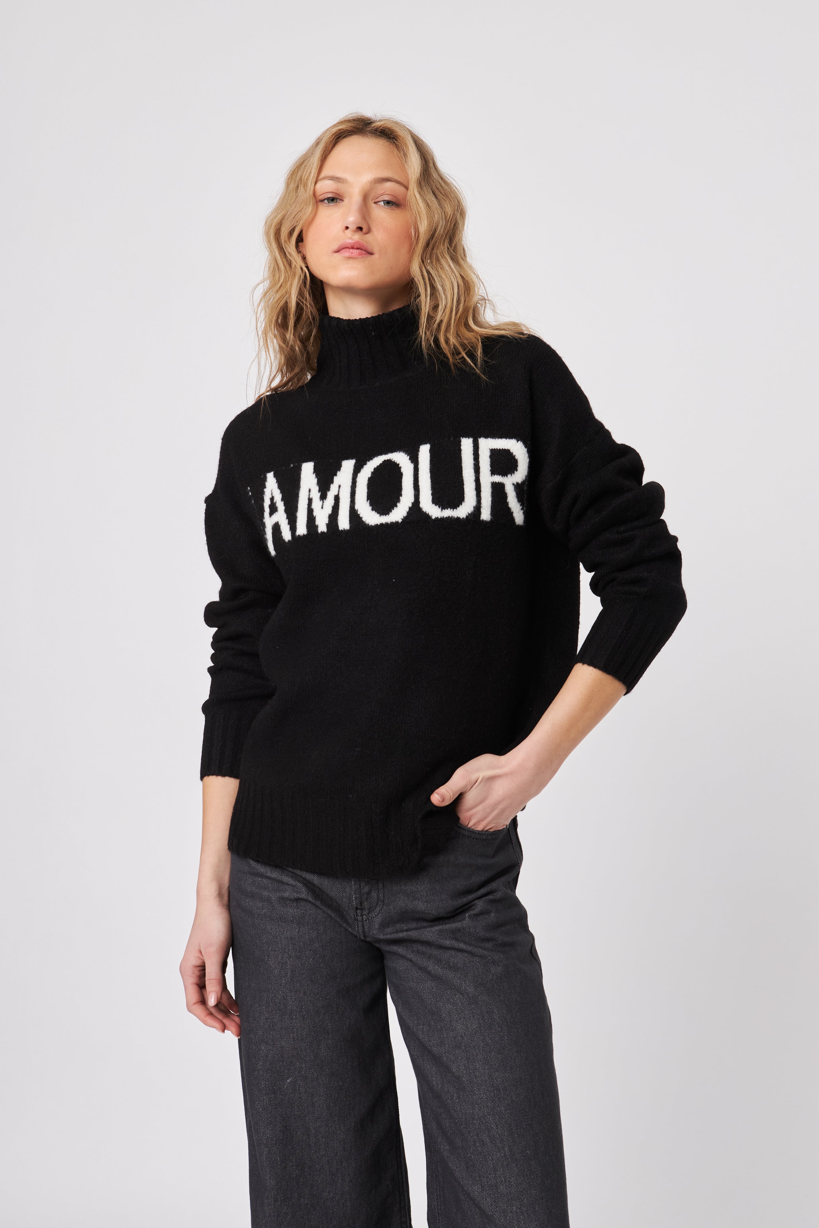 Wrap yourself in cozy sass with the Amour Sweater. This black oversized knit features a bold "AMOUR" print across the front and a snug turtleneck for extra warmth. Perfect for adding a playful, chic touch to your casual look while staying comfy and warm all day long.