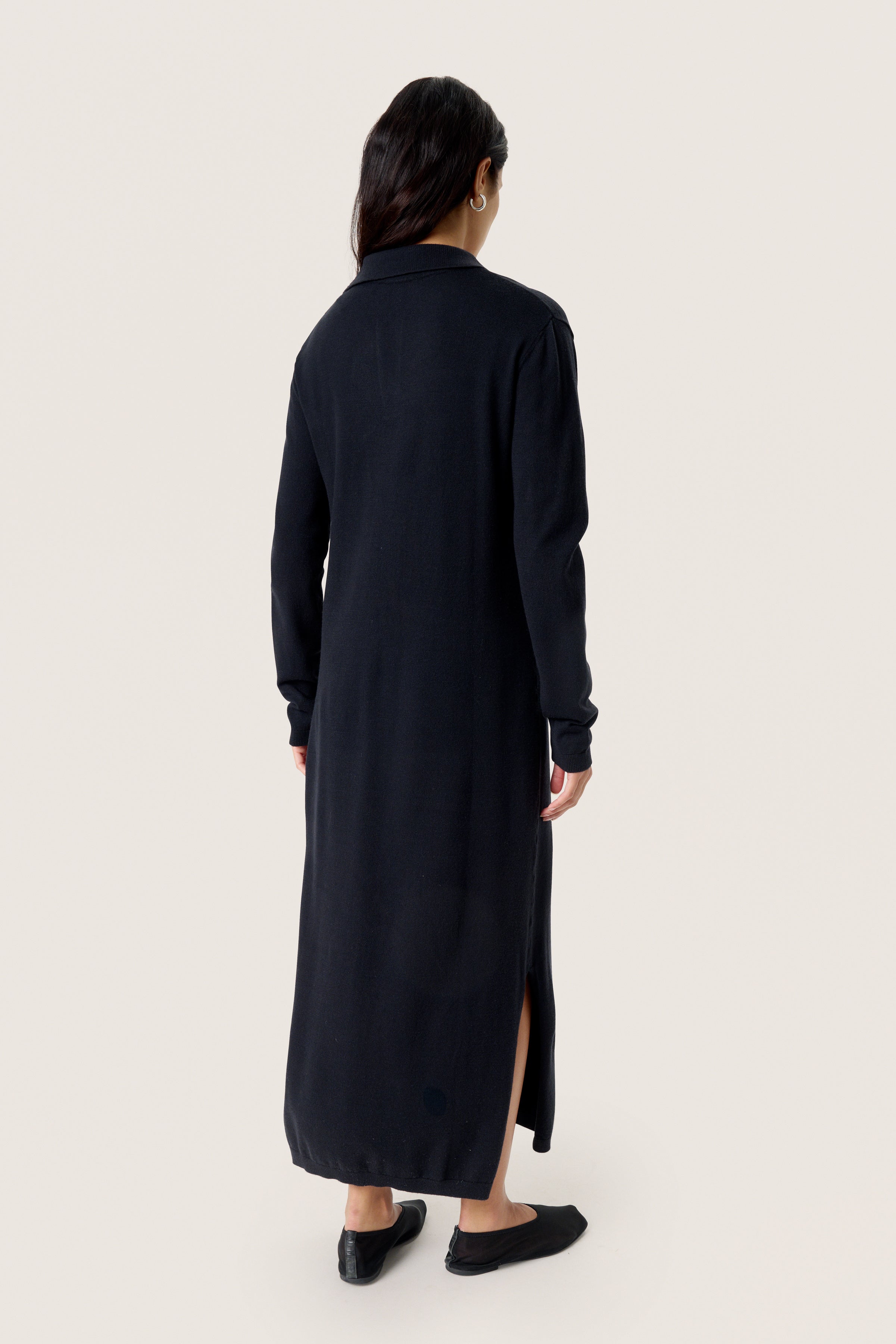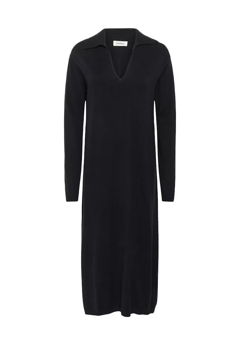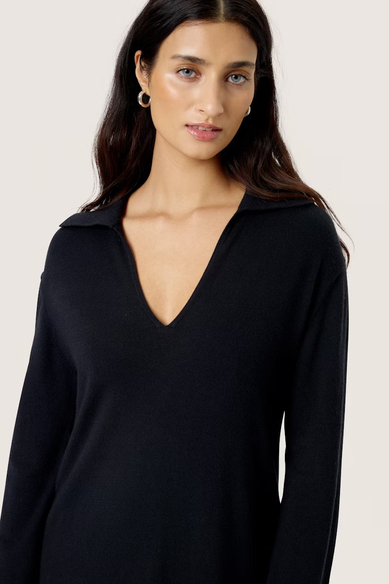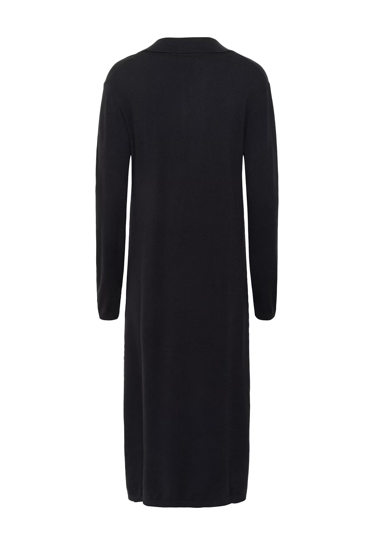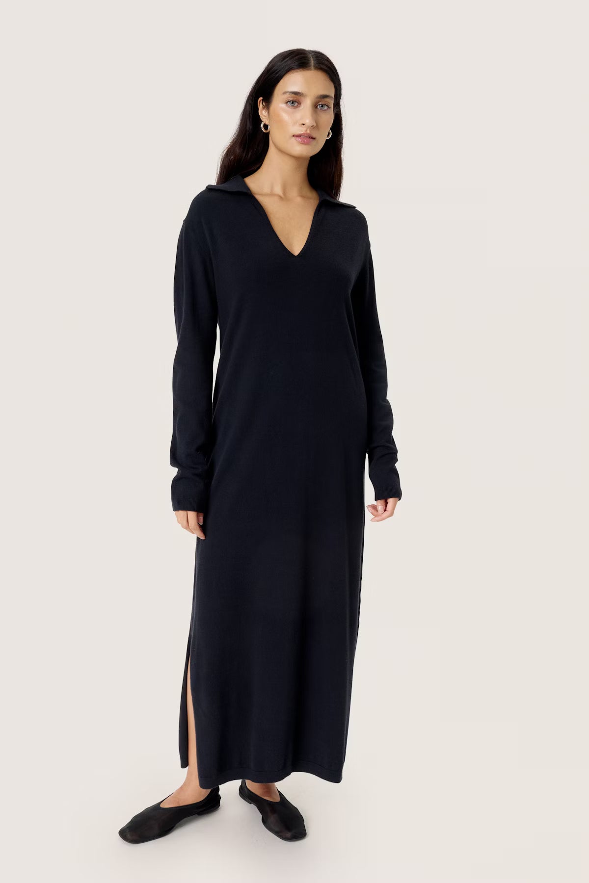 This elegant long black dress features a playful V-neck and collar, complemented by long sleeves and flirty side slits. It strikes the perfect balance between laid-back and chic. Our model, standing 174 cm tall, is rocking a size M.