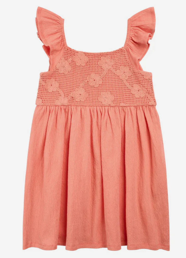 Pretty in coral, this sweet sleeveless dress by Miles the Label is going to be her go to piece this spring/summer. Featuring a crochet flower top and a loose fit, style and comfort in one piece. Made from 96% Organic Cotton, 3% Polyester, 1% Elastane. Machine wash in cold water.